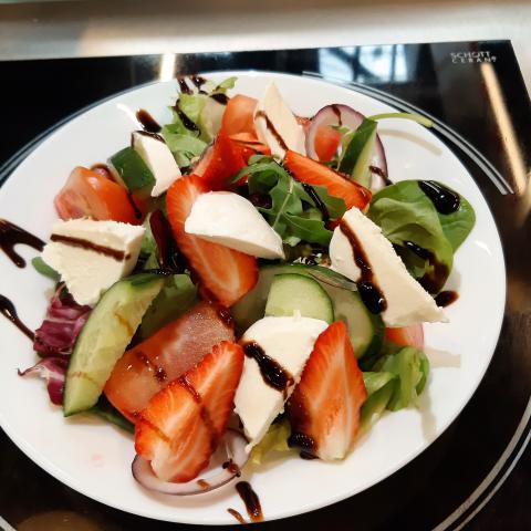 "Sałatka szefa" to kompozycja mixu sałat, pomidorów, ogórka, mozzarelli i słodkich truskawek skropiona sosem balsamiko